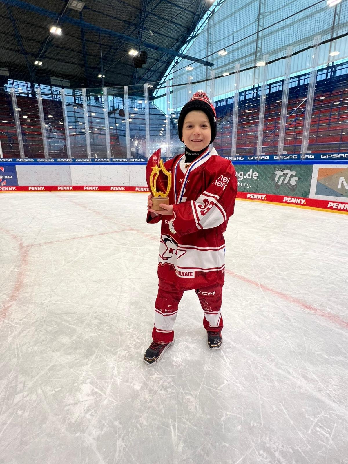 I started playing hockey in June 2024 at the Kölner Haie skating school — and from that moment on, I couldn’t imagine my life without this sport. After only three courses, I was able to move up to the U7 team, and thanks to my hard work and fast progress, I am now successfully playing in the U9.